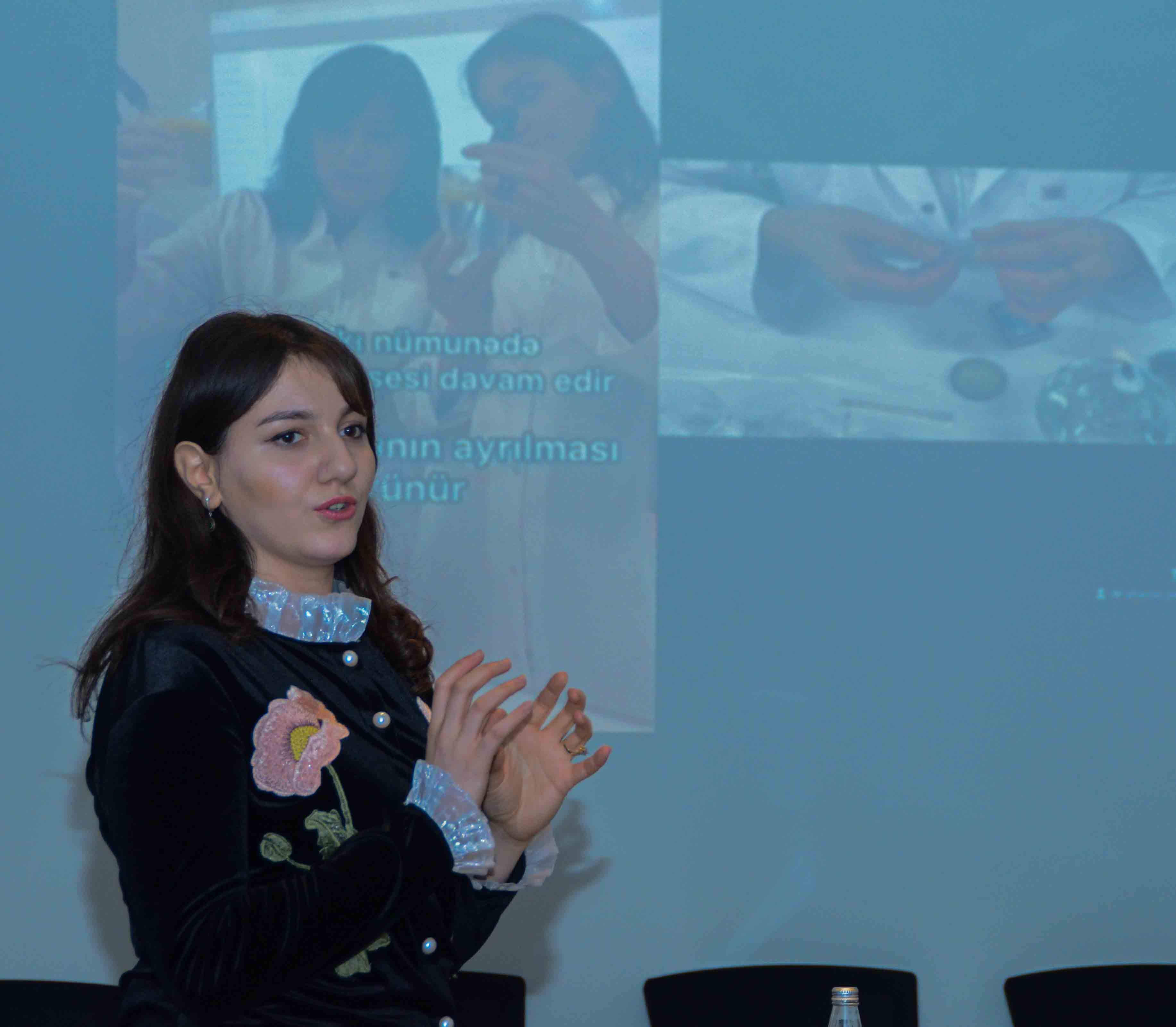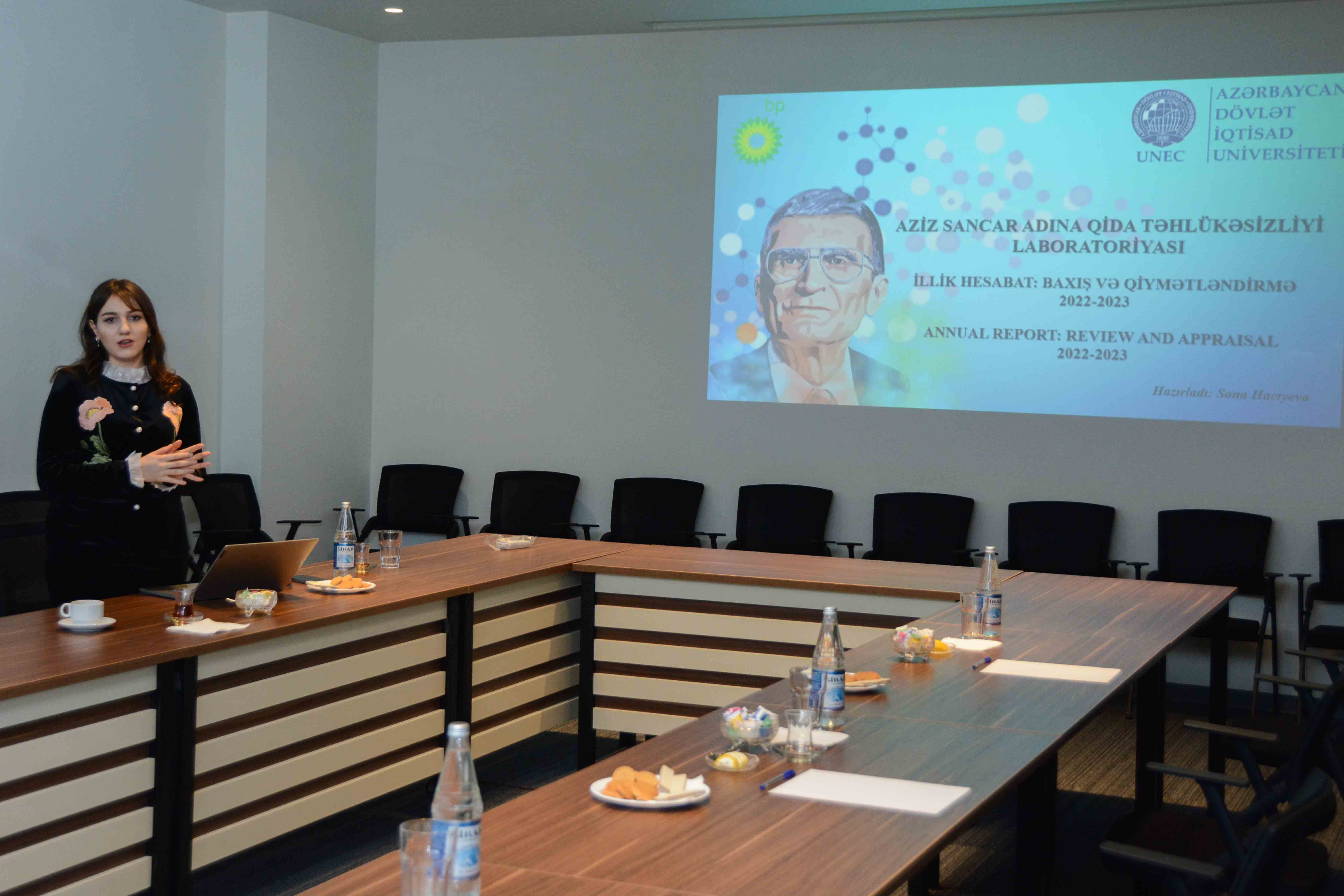 Görüşdə laboratoriyanın əməkdaşı, gənc tədqiqatçı və laborant Sona Hacıyeva təqdimatla çıxış edərək, Aziz Sancar adına Qida Təhlükəsizliyi Laboratoriyasının fəaliyyəti, aparılan tədqiqatlar və ekspertizalar, təlim və tədris planına uyğun elmi-praktiki araşdırmalar, qida məhsullarının müvafiq keyfiyyət standartları və tələblərə uyğunluğunun qiymətləndirilməsi prosesləri barədə məlumat verib. Həmçinin laboratoriyanın işinin daha da təkmilləşdirilməsi ilə bağlı təkliflər səsləndirib.