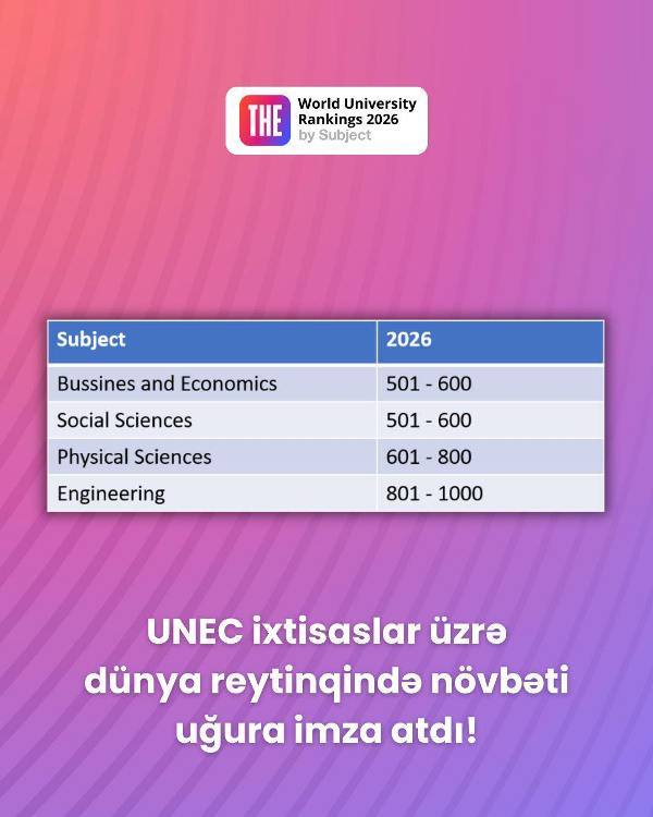 İlk dəfə olaraq, UNEC Biznes və İqtisadiyyat, həmçinin Sosial elmlər istiqamətləri üzrə dünya reytinqində 501–600-cü yerlə yüksəlib. Bununla yanaşı, UNEC Fizika elmlər üzrə 601–800, Mühəndislik sahəsi üzrə isə 801–1000-ci yerləri tutub.