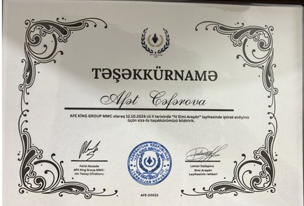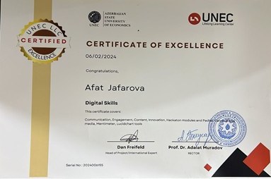 19.06.2023 cü il. Azərbaycan Respublikası İqtisad Universitetinin rektoru prof. Ədalət Muradov tərəfindən Universitetin həyatında fəal iştirakına görə Təşəkkürnamə ilə  təltif olunmuşdur.